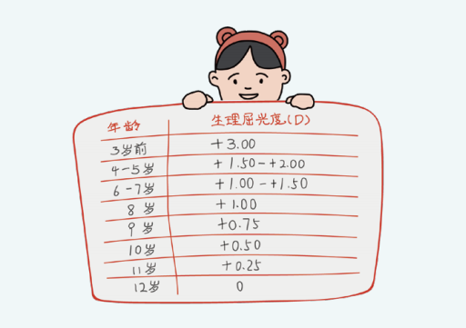 每个年龄孩子的远视储备量可以参考下表:如4∼5岁的儿童生理屈光度为 150∼200度远视,则有150∼200度的远视储备,如果此年龄段儿童的生理屈光度只有50度远视,意味着其远视储备消耗过多,有可能较早出现近视。