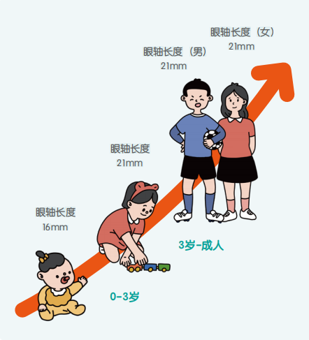 其实,人一生下来是远视眼,而不是正视眼。儿童期眼球发育过程是“眼轴不断延长、眼球不断长大”的过程。伴随着孩子成长,眼轴在不断延长,眼睛的发育将不断抵消远视的度数,逐渐发育成正视眼。